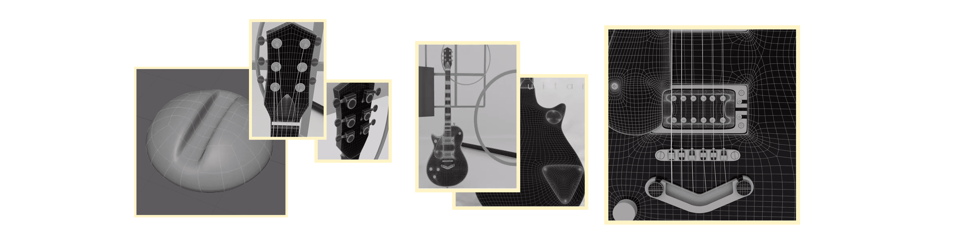 I used detailed modeling techniques, creating the guitar entirely with quads: from its body to the strings, including screws and grooves. The video was finalized in After Effects.